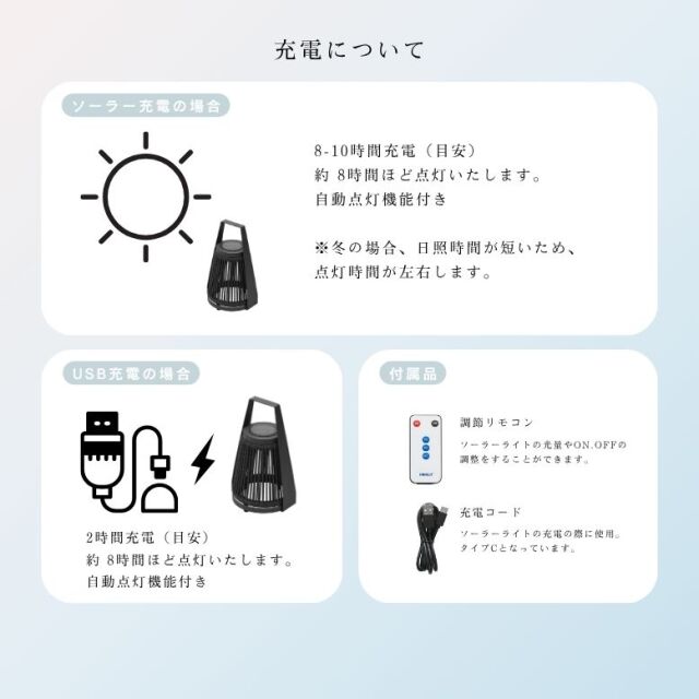 ・ソーラーパネル充電(自動/手動点灯切替可)