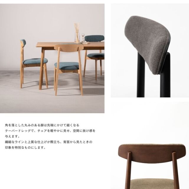 角を落とした丸みのある脚は先端にかけて細くなるテーパードレッグで、チェアを軽やかに見せ、空間に抜け感を与えます。