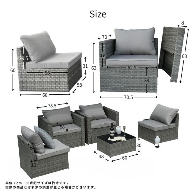 コーナーソファ(肘掛けなしの場合):約 横幅70.5×奥行70×高さ63cm