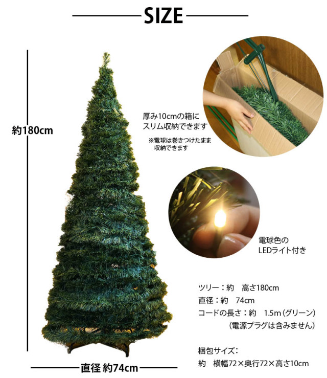 TOPシーズン・アウトドアアイテム 秋冬のおすすめ クリスマス クリスマスツリー アコーディオンツリー180cm ヌードツリー イルミネーションライト付き (Accordion tree 180) 【送料無料】 価格: ¥13,900 (税込) 販売期間: 通常1~2営業日以内に発送(休業日除く): 選択してください 了承します お客様都合による返品は不可となります: 選択してください 了承します 大型宅配便の注意事項(北海道・沖縄・離島): 【大型宅配便】北海道・沖縄・離島への配送は、別途送料お見積りします 選択してください 了承します 数量: 個 在庫: × 在庫 × 返品についての詳細はこちら ■商品名 アコーディオンツリー180cmサイズ イルミネーションライト付き ■サイズ(cm) ・ツリー本体: 約 直径74cm×高さ180cm ・コードの長さ: 約 1.5m(電源プラグは含みません) ■梱包サイズ(cm) 約 横幅72×奥行72×高さ10cm ■商品重量:約6.5kg ■LED色:電球色(常灯・点滅なし) ■電圧:AC100V ■使用環境:屋内仕様 ※屋外で使用しますと、故障の原因となりますのでご注意ください。 ■材質 ツリー:PVC樹脂・スチール ベース:スチール ■形式:組立式 ■注意点 室内用となっています。屋外で使用しますと故障の原因になりますのでご注意ください。 関連商品はこちら DEPOS テーブル シラカバ ツリー ブランチツリー ライト 80cm 【送料無料】 ¥2,990(税込) DEPOS シラカバツリー ブランチライト ミニ USB付き 送料無料 ¥3,280(税込) 在庫  ○ DEPOS NEWシラカバツリー ブランチライト ホワイト 180cm【送料無料】 ¥11,000(税込) 在庫  ○ DEPOS シラカバツリー ブランチライト 120cm 【送料無料】 ¥6,980(税込) 在庫  ○ DEPOS シラカバツリー ブランチライト 150cm (DEPOS birch tree branch light 150cm) 【送料無料】 ¥9,680(税込) 在庫  ○ DEPOS カーテンライト48球 スター(DEPOS Curtain Light Star) 【送料無料】 ¥3,180(税込) 在庫  ○ DEPOS シラカバ スノーフレークライト (DEPOS birch tree snow flake light) 【送料無料】 ¥2,200(税込) 在庫  ○ ブローライトはしごサンタ 1ピース (Blow light Ladder santa 1 piece) ¥5,280(税込) 在庫  ○ ブローライト はしごサンタ S 3P (Blow light Ladder santa S)【送料無料】 ¥9,500(税込) 在庫  ○ ブローライト はしごサンタ L3P (Blow light Ladder santa L)【送料無料】 ¥11,800(税込) 在庫  ○ アコーディオンツリー150cm ヌードツリー イルミネーションライト付き (Accordion tree 150) 【送料無料】 ¥9,900(税込) 在庫 × アコーディオンツリー180cm イルミネーションライト・オーナメントセット付き (Accordion tree 180 Ornament set)【送料無料】 ¥16,200(税込) 在庫 × アコーディオンツリー150cm イルミネーションライト・オーナメントセット付き (Accordion tree 150 Ornament set)【送料無料】 ¥12,200(税込) 在庫 × ブローライト スノーマン (Blow light snowman)【送料無料】 ¥12,200(税込)