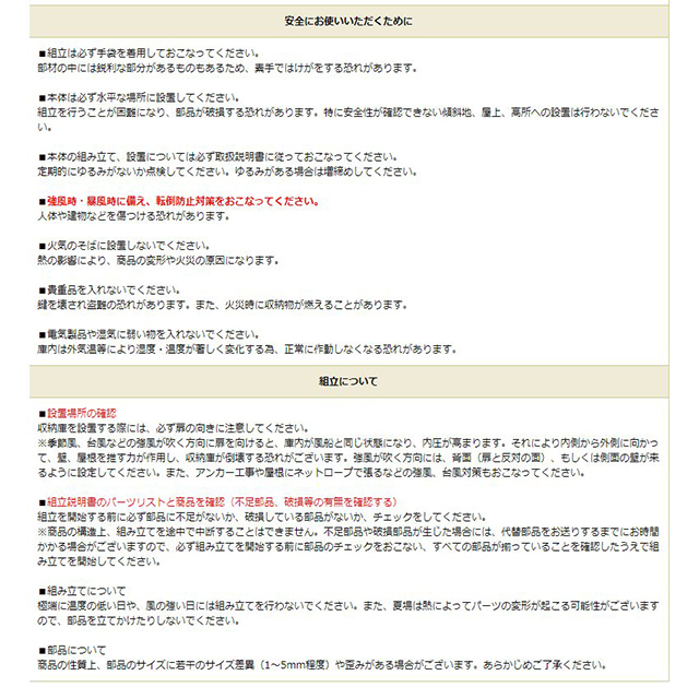 組立を行うことが困難になり、部品が破損する恐れがあります。特に安全性が確認できない傾斜地、屋上、高所への設置は行わないでください。