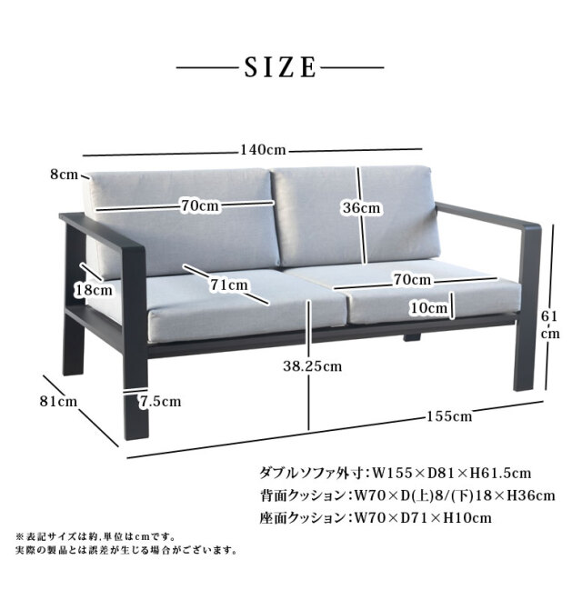 ダブルソファ外寸 約 横幅155×奥行81×高さ61.5cm