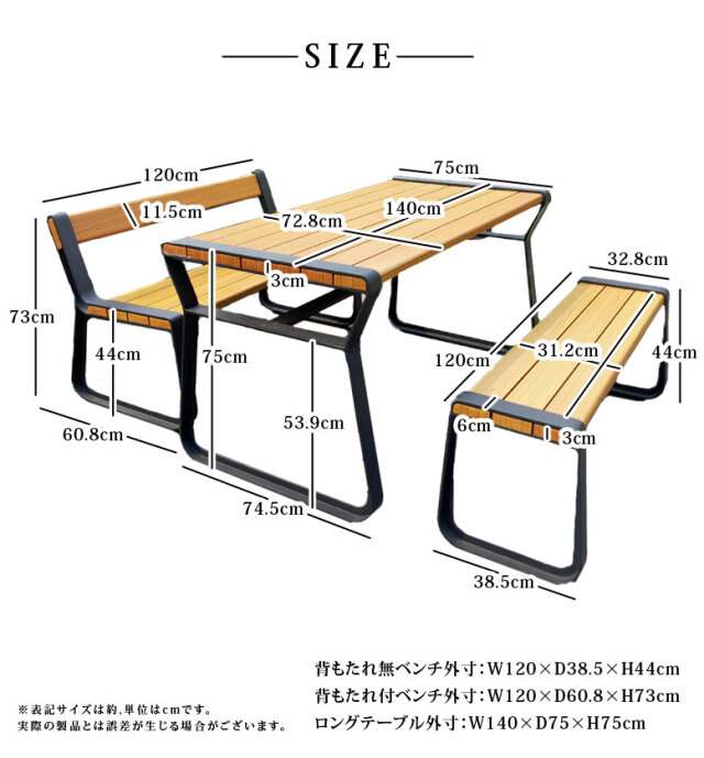 背もたれ付ベンチ外寸 約 横幅120×奥行60.8×高さ73cm