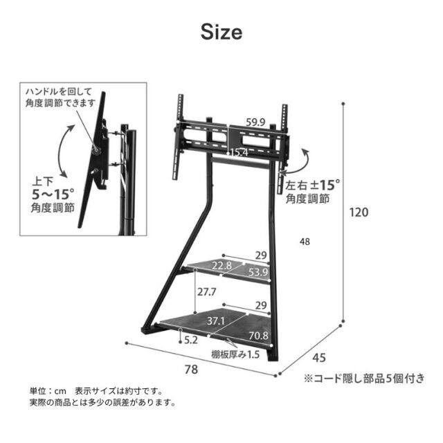 上下5-15度、左右±15度角度調整可能、テレビの高さも2段階調節可能。