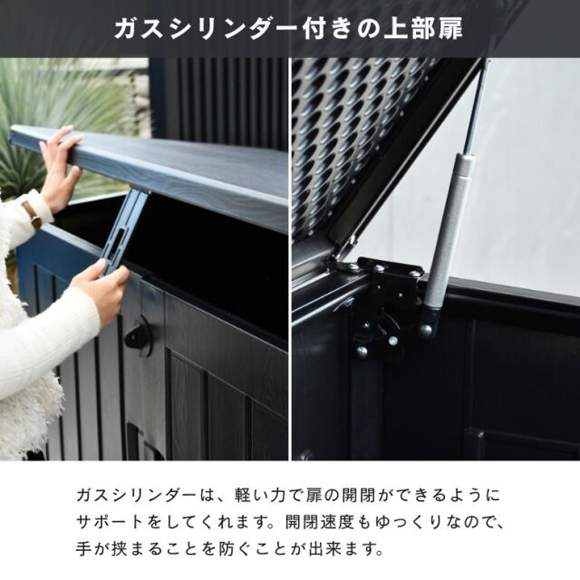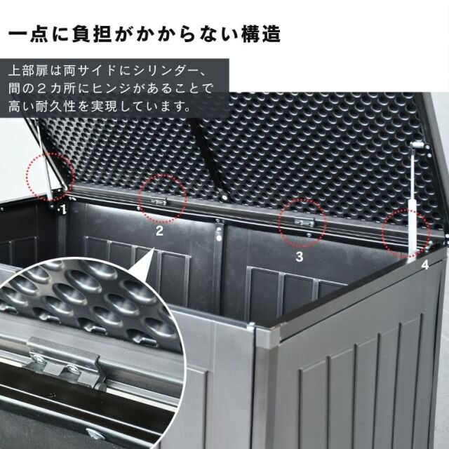 ・軽い力で上蓋の開閉ができる、シリンダー付きで手を挟む心配も少ない。