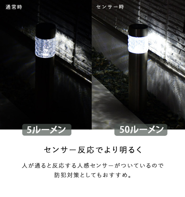 ・通常点灯時は柔らかい光、人を感じると強い光が灯るので、足元灯やアプローチにお勧めのセンサーライトです。