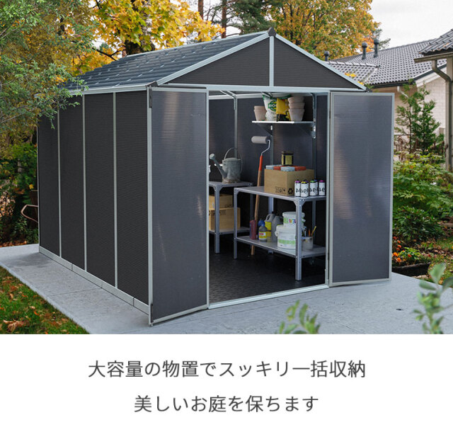 大容量の物置ですっきり一括収納。美しいお庭を保ちます。