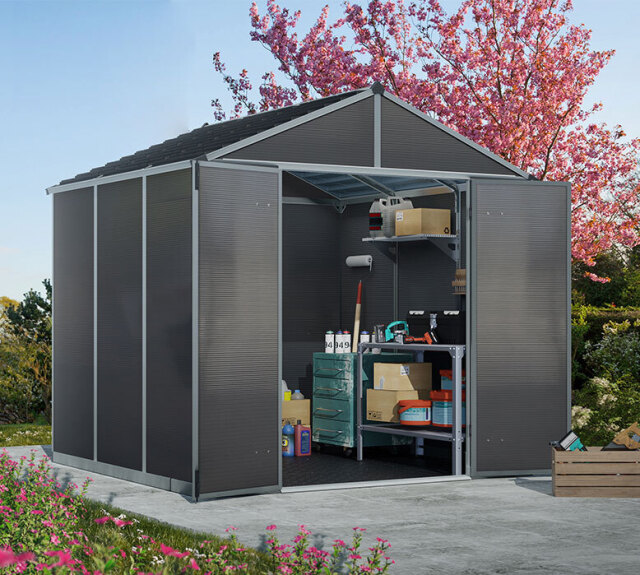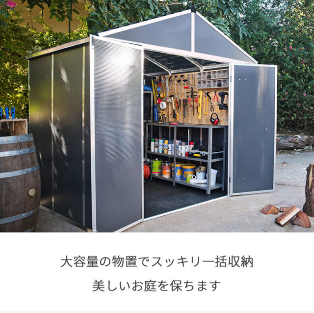 大容量の物置ですっきり一括収納。美しいお庭を保ちます。